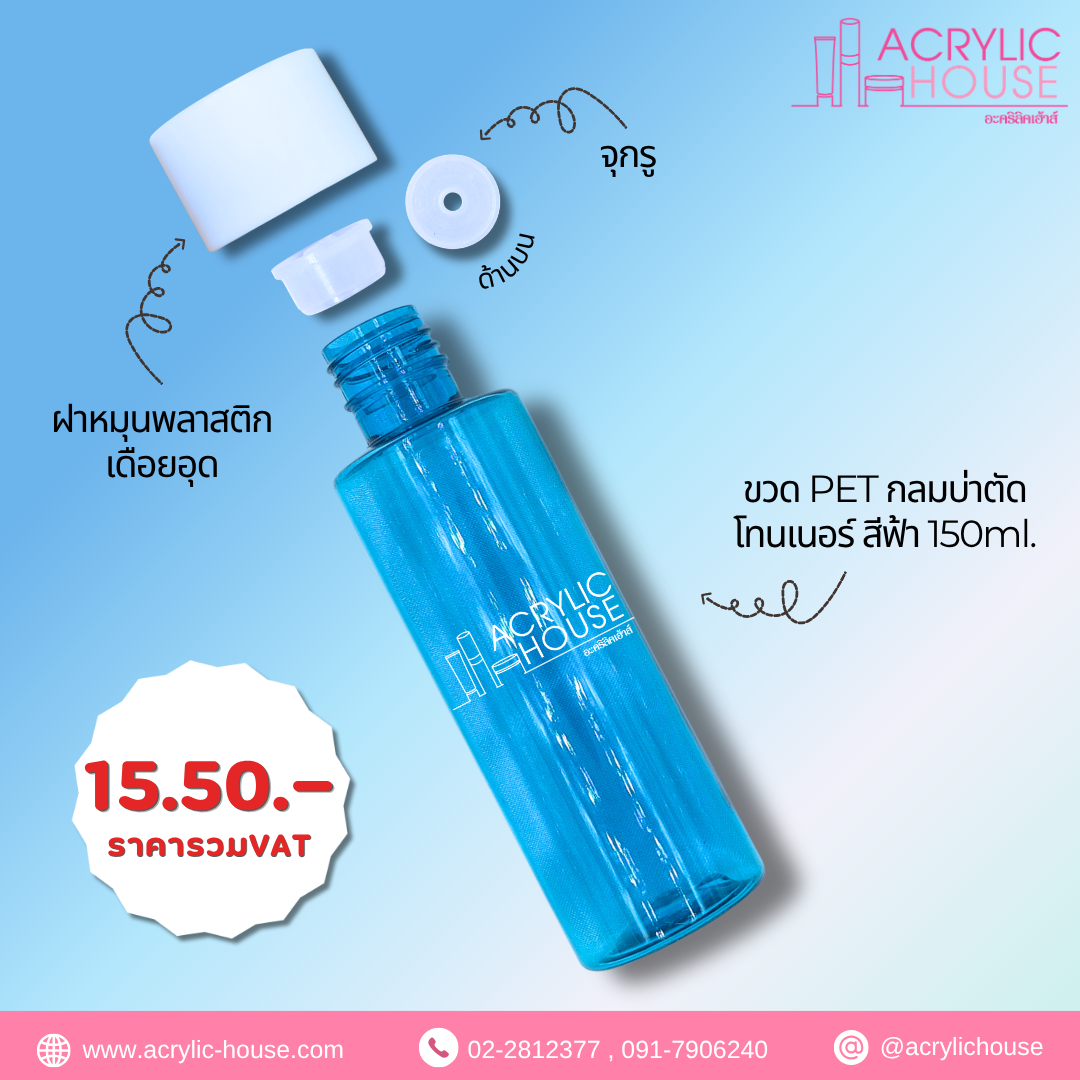 ขวด PET กลมบ่าตัดโทนเนอร์สีฟ้า 150ml + ฝาหมุนพลาสติกเดือยอุด + จุกรู