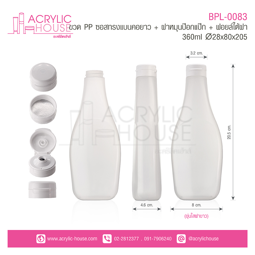 ขวด PP ซอสทรงแบนคอยาว + ฝาหมุนป๊อกแป๊ก + ฟอยล์ใต้ฝา 360ml.