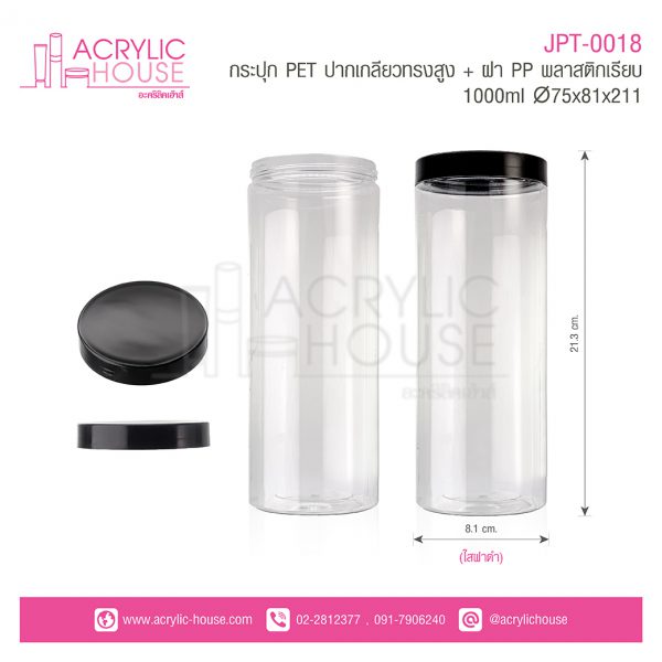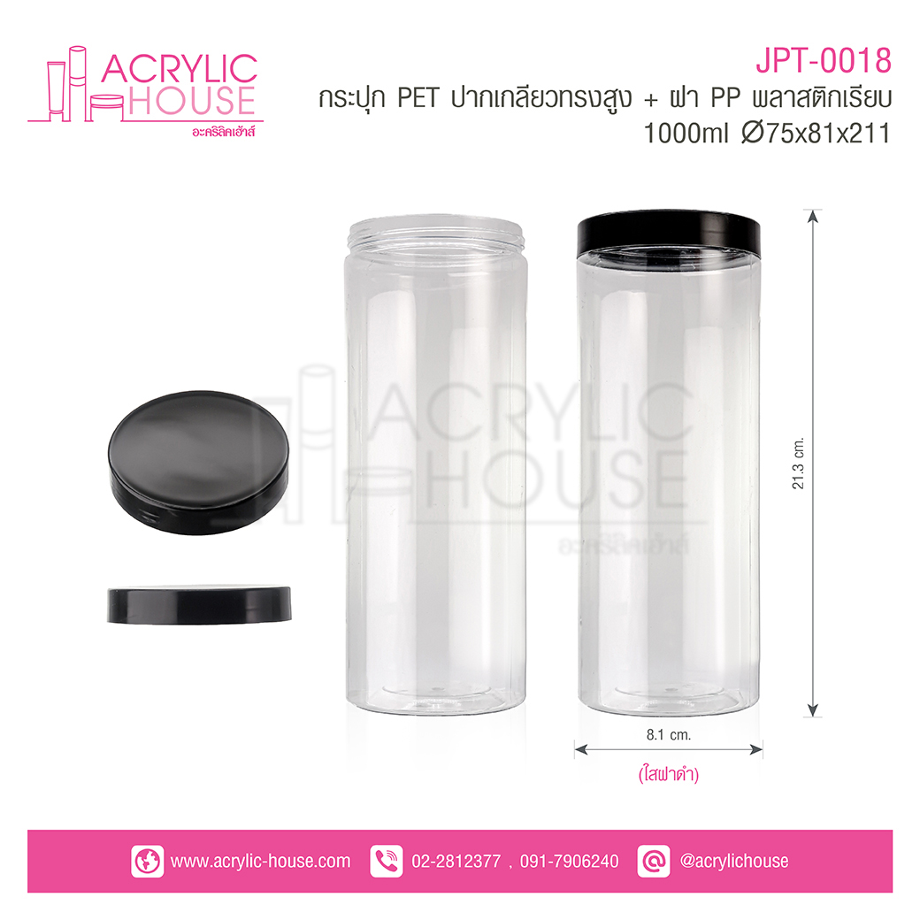 กระปุก PET ปากเกลียวทรงสูง + ฝา PP พลาสติกเรียบ 1000 ml